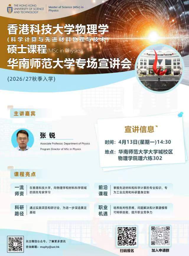 1. 香港科技大学物理学(科学计算与先进材料物理与技术)理学硕士26FALL入学!华南师范大学专场招生宣讲会暨学术分享会